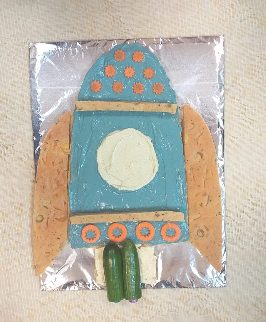 בשבוע של הטיסה לחלל, ערכנו בגן ארוחת בוקר חגיגית. כל הארוחה הייתה מותאמת לאלרגיות של בארי ולילדה הצליאקית. והנראות שלה- וואוו איזו הפקה הרמנו! על השולחנות נפרשו מפות כסופות ועליהן הגשנו שיפודי פירות בצורת טיל, פריכיות וחצאי פיתה שדימו את הירח, פלטות פירות כתום-צהוב כמו השמש, גבינה צהובה שנחתכה לכוכבים, פשטידת תירס מצופה גבינות וירקות בצורת חללית ועוד.